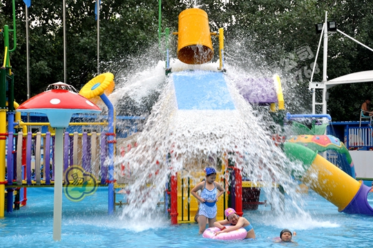 張著大嘴的青蛙滑梯,造型奇特的蘋果屋,各種水槍、蹺蹺板,小水寨不斷輸送著一桶桶水,一潑而下,酣暢....
