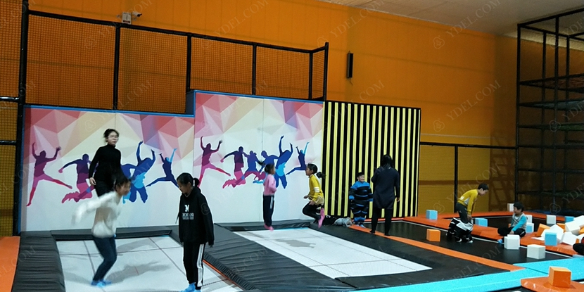 場內設有近800㎡的綜合性蹦床區,包括專業蹦床區、競技躲避球區、兒童躲避球區、跑酷區、斜蹦面區、自由彈跳區、彈跳籃球區、海綿池區