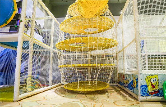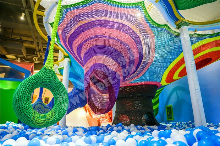 巨大彩虹樹,各色搭配,全手工網繩編織,結實耐用,由略平樹冠和中空樹干兩部分組成,扁平樹冠容納多名孩子攀爬,懸掛球星設備晃蕩,既美觀又好玩。